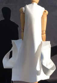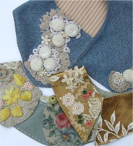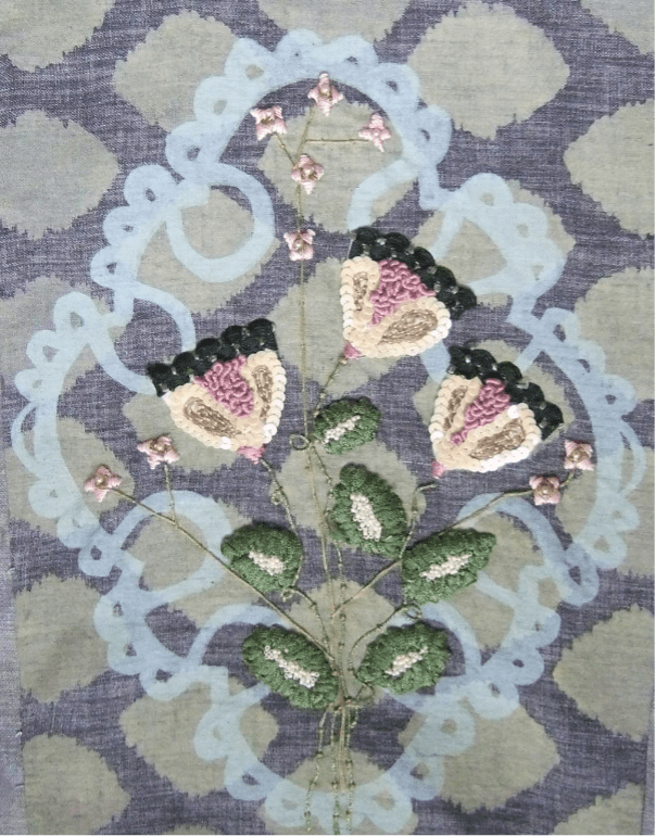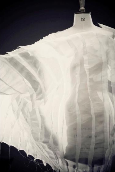 The designs develop thematically, processes emerging from the research to involve print – devoree, discharge printing, screen printing, hand dying methods, and a wide range of embellishment techniques.